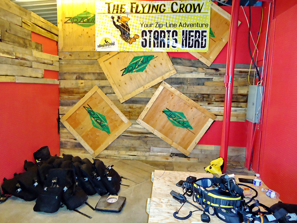 All customers are fitted with a harness, helmet and ZipTour® backpack and trolley. Customers begin their ZipTour® “Flying Crow” zip line adventure with a walk to the “Demo Zip” behind the equipment building. The “Demo Zip” is a very short zip line span across water that allows riders to become familiar with the ZipTour® trolley braking mechanism, and assures both the customer and the operators/guides that they are ready for a safe and exhilarating flight across Lake Shafer.