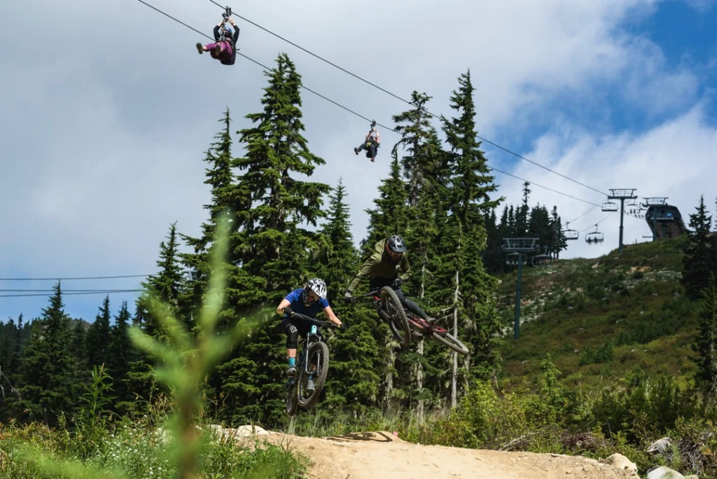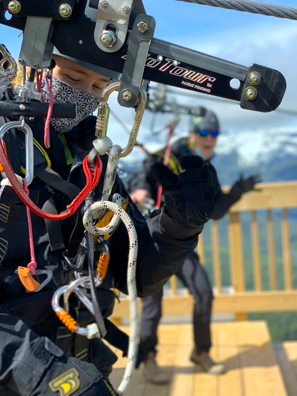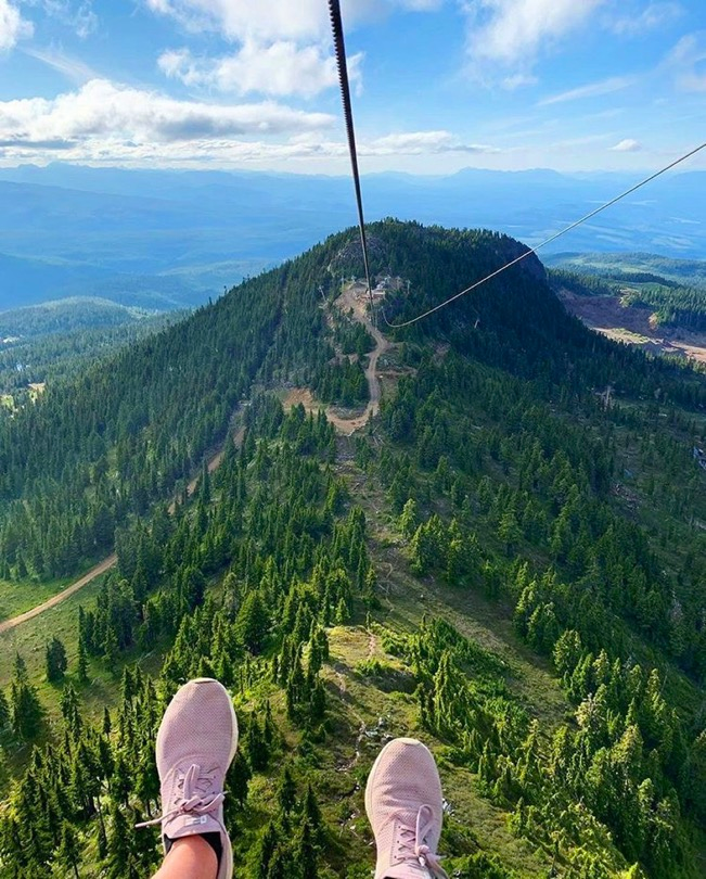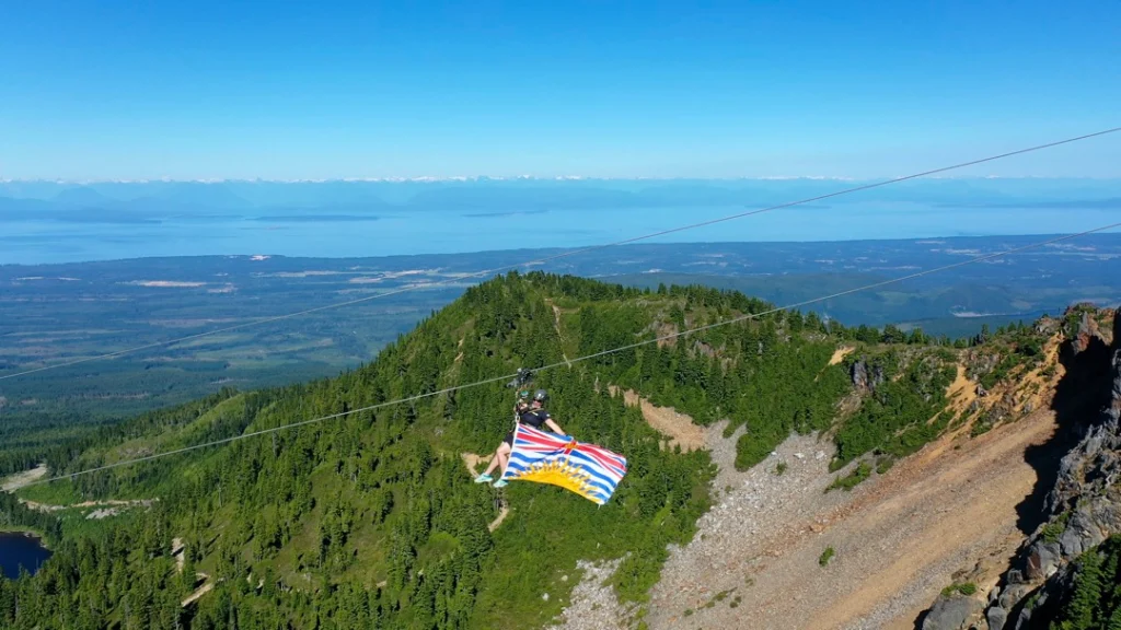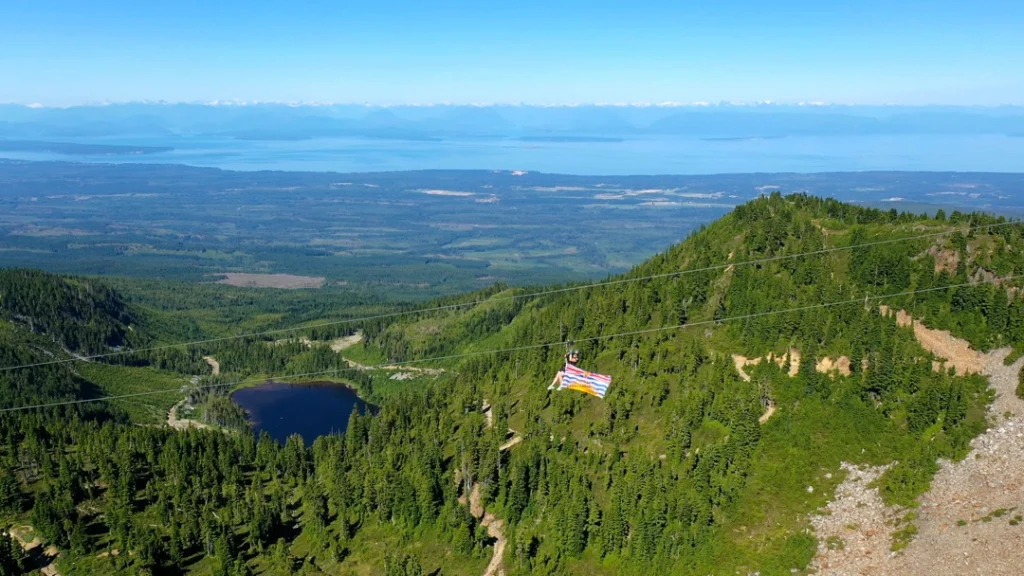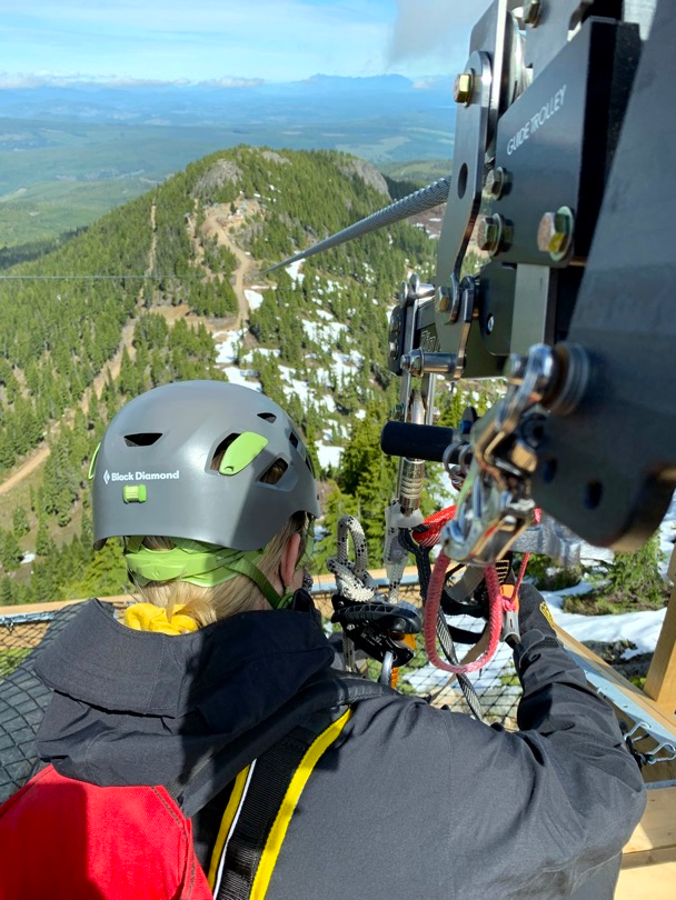 Once customers have completed their ZipTour® orientation and have practiced riding on the Demo Zip, the experience continues with a scenic ride up the Eagle chairlift. The first span of the ZipTour®, ‘The Abyss’, launches from the Top of the World area at an elevation of 5,200 feet, and descends 302 vertical feet to the Little Washington peak and top of the Boomerang lift. Riders soar 275 ft above the forested valley below, surrounded by scenic views of the Strait of Georgia, Comox Valley, the Coast Mountains, and nearby Strathcona Provincial Park.