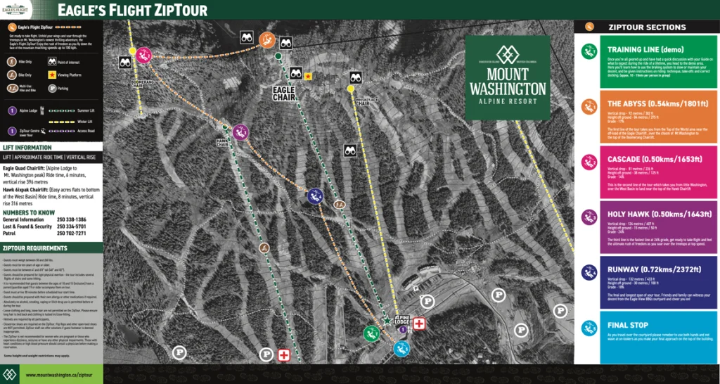 Mt. Washington Alpine Resort is located 30 minutes north of the Comox Valley on beautiful Vancouver Island, and is easily accessible via Highway 1 and through the Comox International Airport. If you are visiting Vancouver Island and looking for an unforgettable adventure, make sure to visit Mt. Washington Alpine Resort to experience this exciting and scenic ZipTour® zip line adventure!