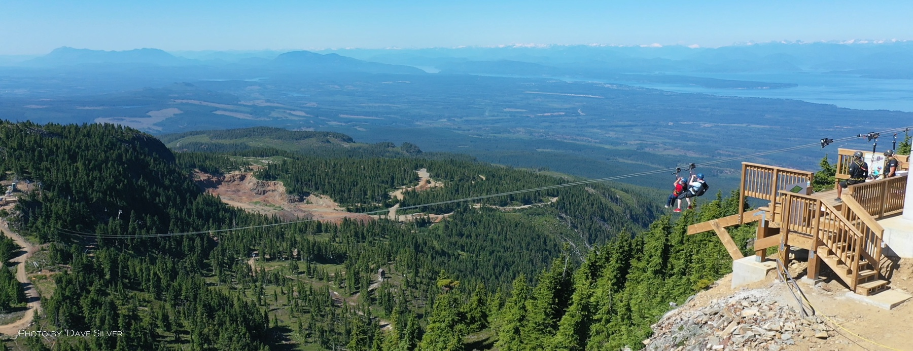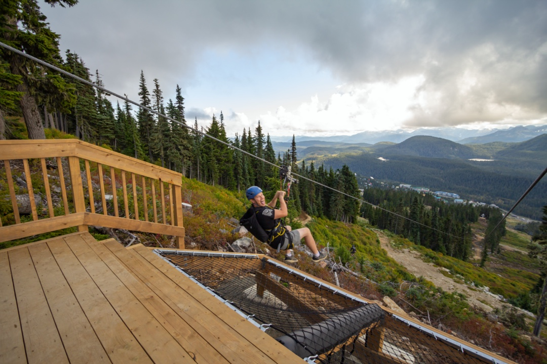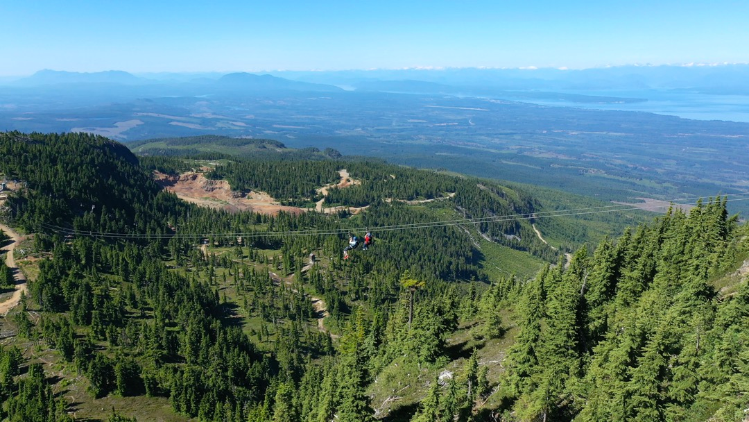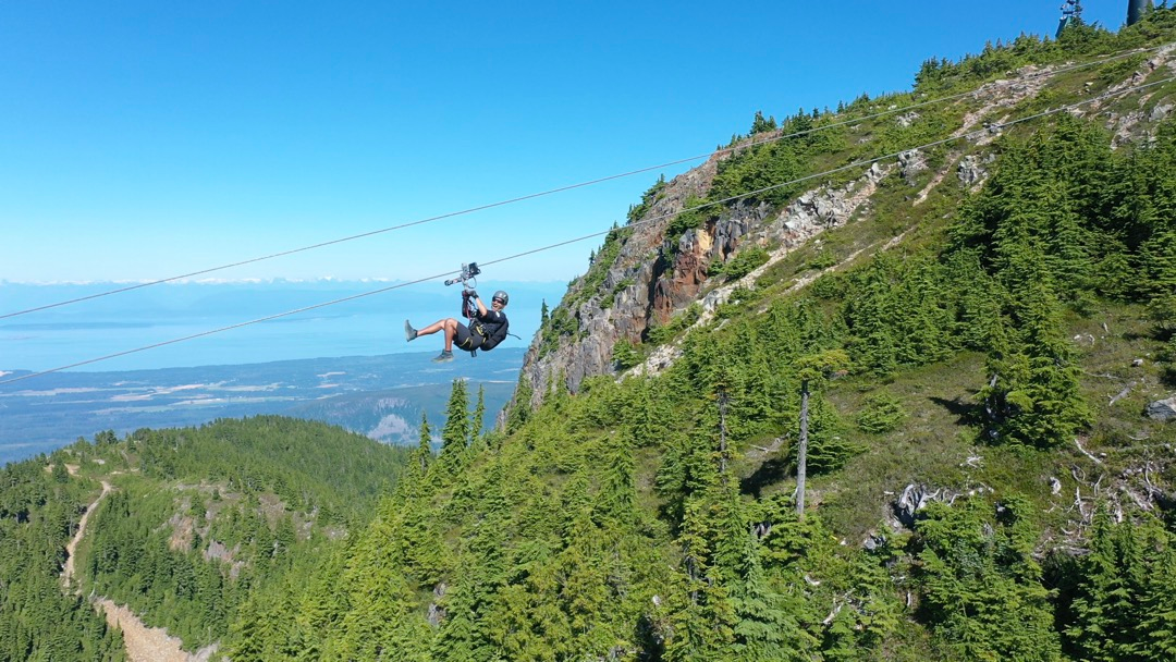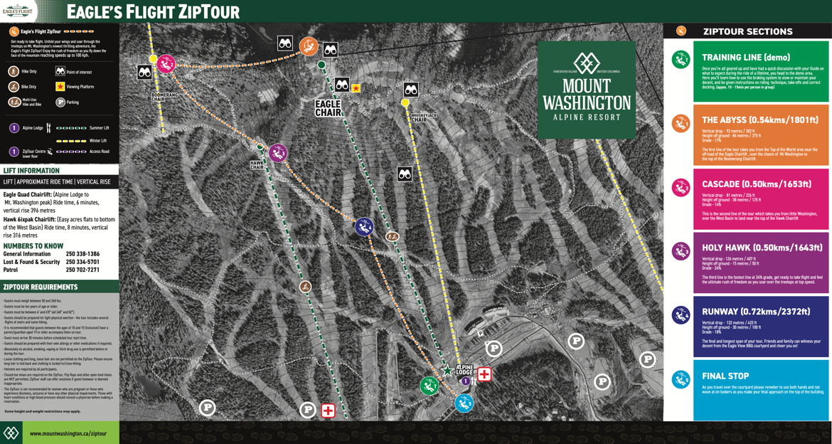 Once customers have completed their ZipTour® orientation and have practiced riding on the Demo Zip, the experience continues with a scenic ride up the Eagle chairlift. The first span of the ZipTour®, ‘The Abyss’, launches from the Top of the World area at an elevation of 5,200 feet, and descends 302 vertical feet to the Little Washington peak and top of the Boomerang lift. Riders soar 275 ft above the forested valley below, surrounded by scenic views of the Strait of Georgia, Comox Valley, the Coast Mountains, and nearby Strathcona Provincial Park.