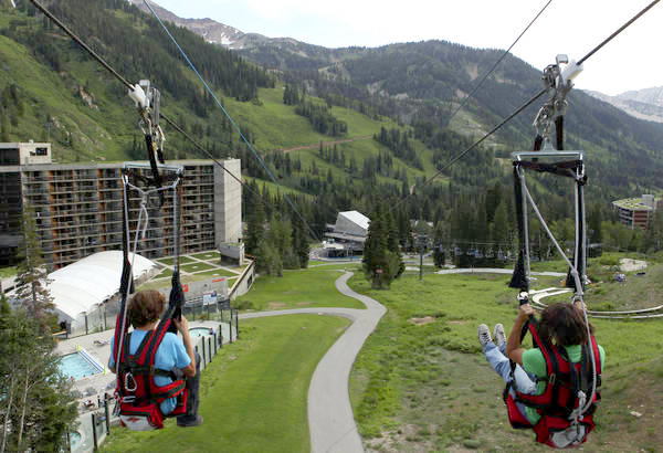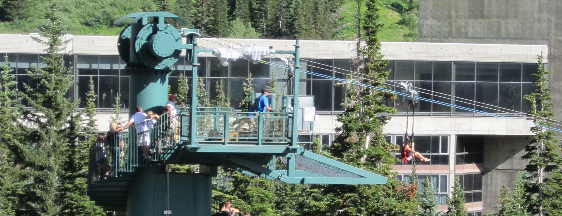 Customers first climb up to the top of the 50 foot tower shown, then launch out the doors to fly down the cables at 30 mph, landing on the expanded Tram building deck. The ZipRider® has been very successful at Snowbird and it is not uncommon for the line to extend all the way down to the ground on weekends. To see riders in action, click the video below. For more information on days and hours of operation, please visit Snowbird’s website at snowbird.com.